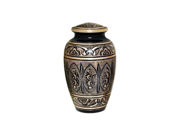 Arbor Urn – A striking black brass urn with intricate leaf etchings and gold accents, symbolizing the beauty of nature and remembrance. (11.25″ x 6.25″ x 6.25″)