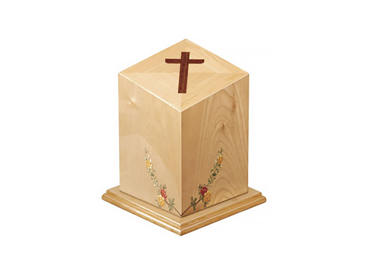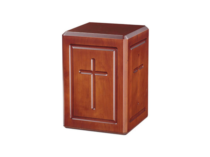 Calvary Wood Urn – Elegantly carved with a cross, this urn symbolizes faith and devotion, offering a serene and respectful resting place. (10″ H x 8″ W x 8″ D)