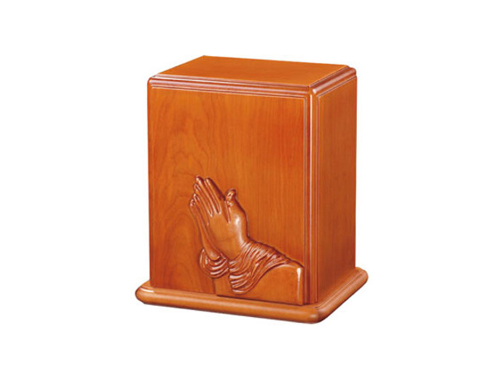 Praying Hands Wood Urn – Featuring intricately carved praying hands, this urn represents peace and prayer, enhanced by its natural wood grain. (10″ H x 8″ W x 8″ D)