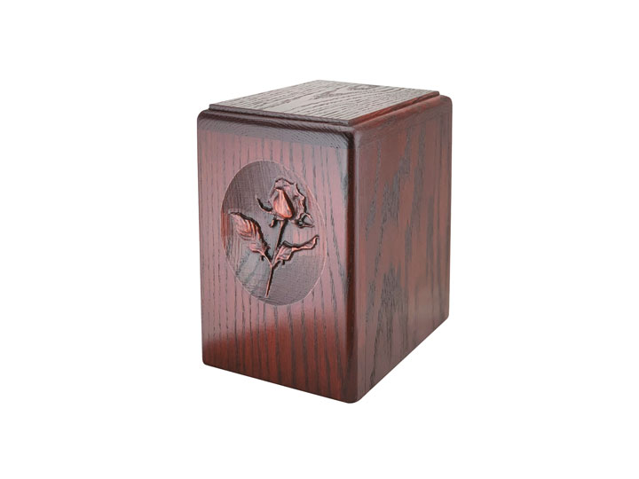 - Cherry Finish Rose Oak Urn – A warm cherry finish with an intricately carved rose, offering a classic and heartfelt tribute.
